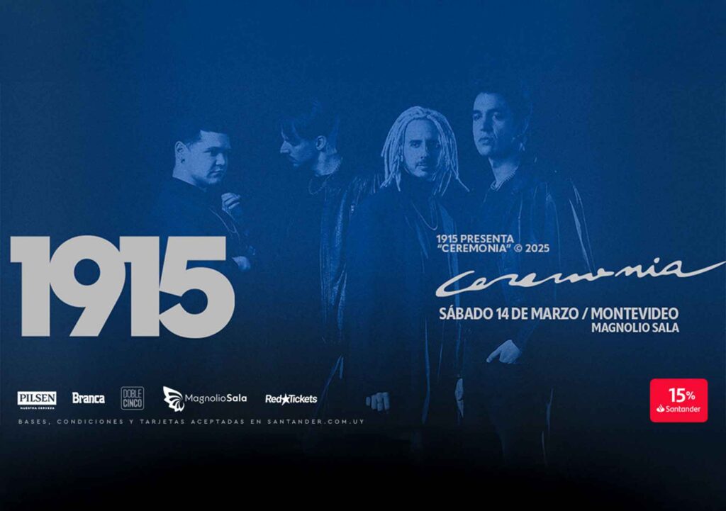 1915 presenta “ceremonia”, su quinto álbum de estudio, con una gira mundial que invita a un viaje sonoro y visual único. un show que atraviesa la oscuridad y la luz, la soledad y la pertenencia, para reencontrarnos en la música. en cada concierto, 1915 propondrá una experiencia inmersiva donde el nuevo sonido de la banda generará un ritual colectivo para recordarnos que no estamos solos.