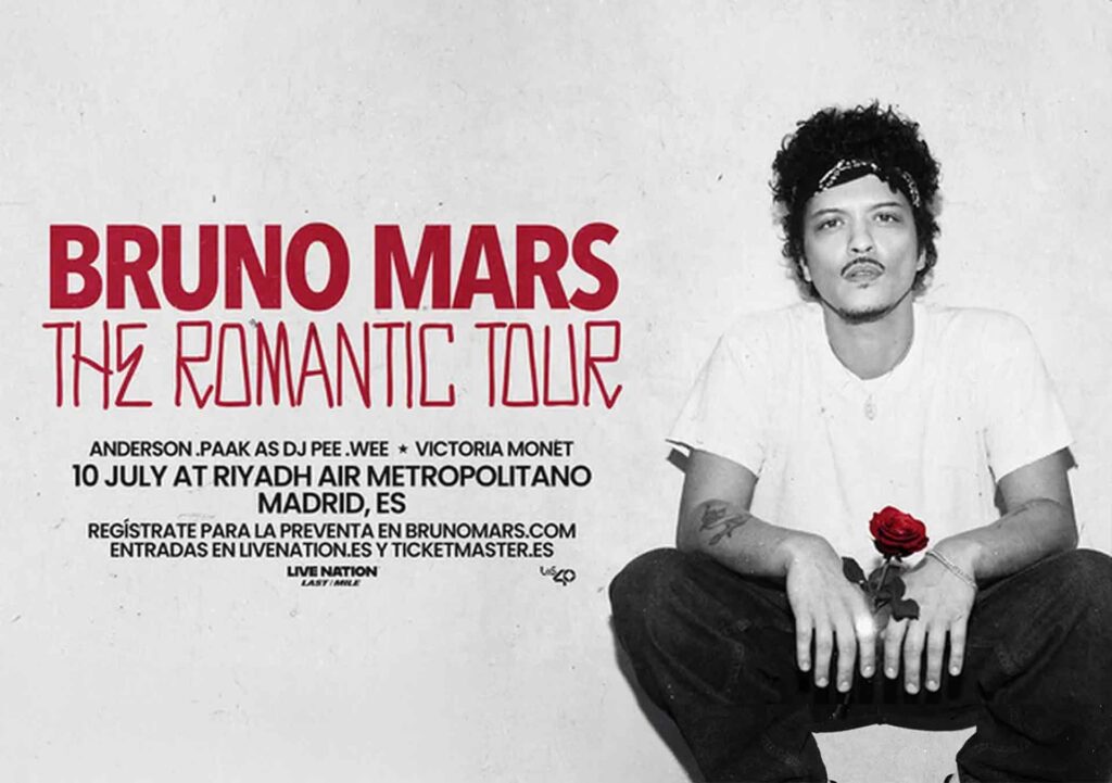 Bruno Mars, ganador de varios premios Grammy, llevará The Romantic Tour a diferentes países de Europa y Norteamérica a lo largo de este 2026. El 10 de julio, Madrid será el escenario elegido para arrancar la gira mundial en el Riyadh Air Metropolitano, que promete ser uno de los tours más destacados del año. Además, el artista contará con la colaboración de Anderson .Paak, su compañero en Silk Sonic, como DJ Pee. Wee, y la cantante Victoria Monét.