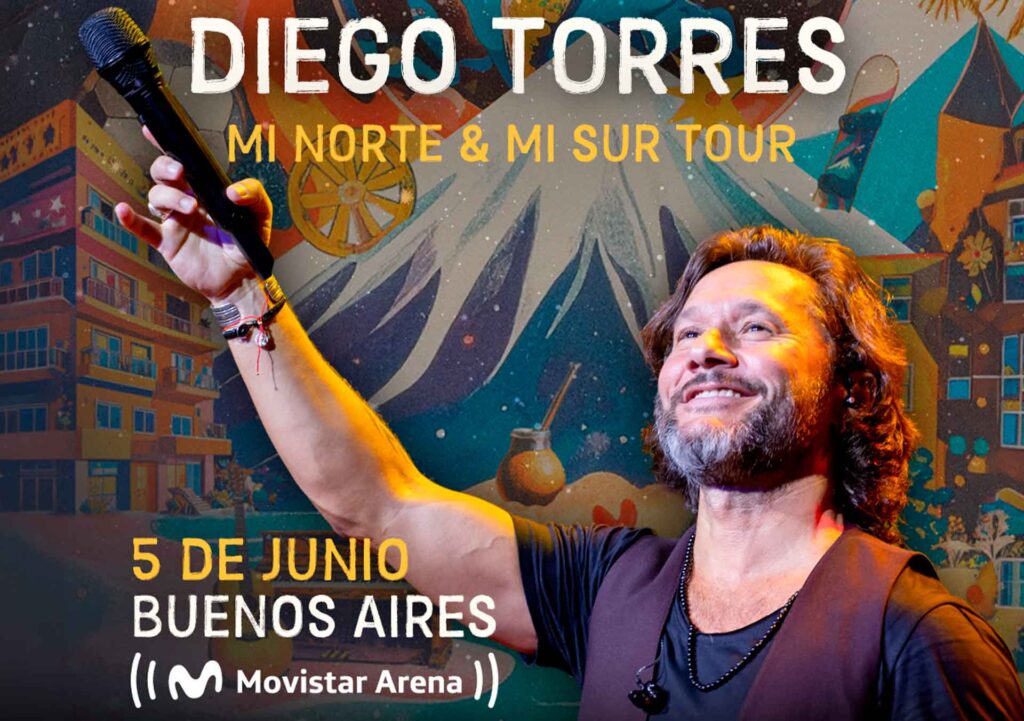 Diego Torres confirmó una nueva presentación en el Movistar Arena de Buenos Aires para el próximo 6 de junio, luego de que las entradas para su show del 5 de junio se agotaran. La nueva fecha forma parte de la gira de presentación de su último álbum, Mi norte & mi sur, y marca su regreso a los escenarios porteños tras una serie de conciertos recientes en el mismo recinto.
