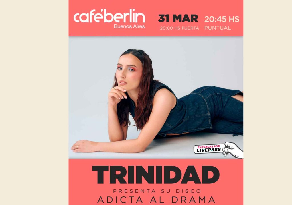 Trinidad anunció su primer show como solista para el 31 de marzo en Café Berlín, Buenos Aires. La presentación girará en torno a Adicta al drama, su álbum debut lanzado a fines de 2025, y será la primera vez que la artista lleve ese material al escenario en un formato integral. Las entradas ya están disponibles a la venta.