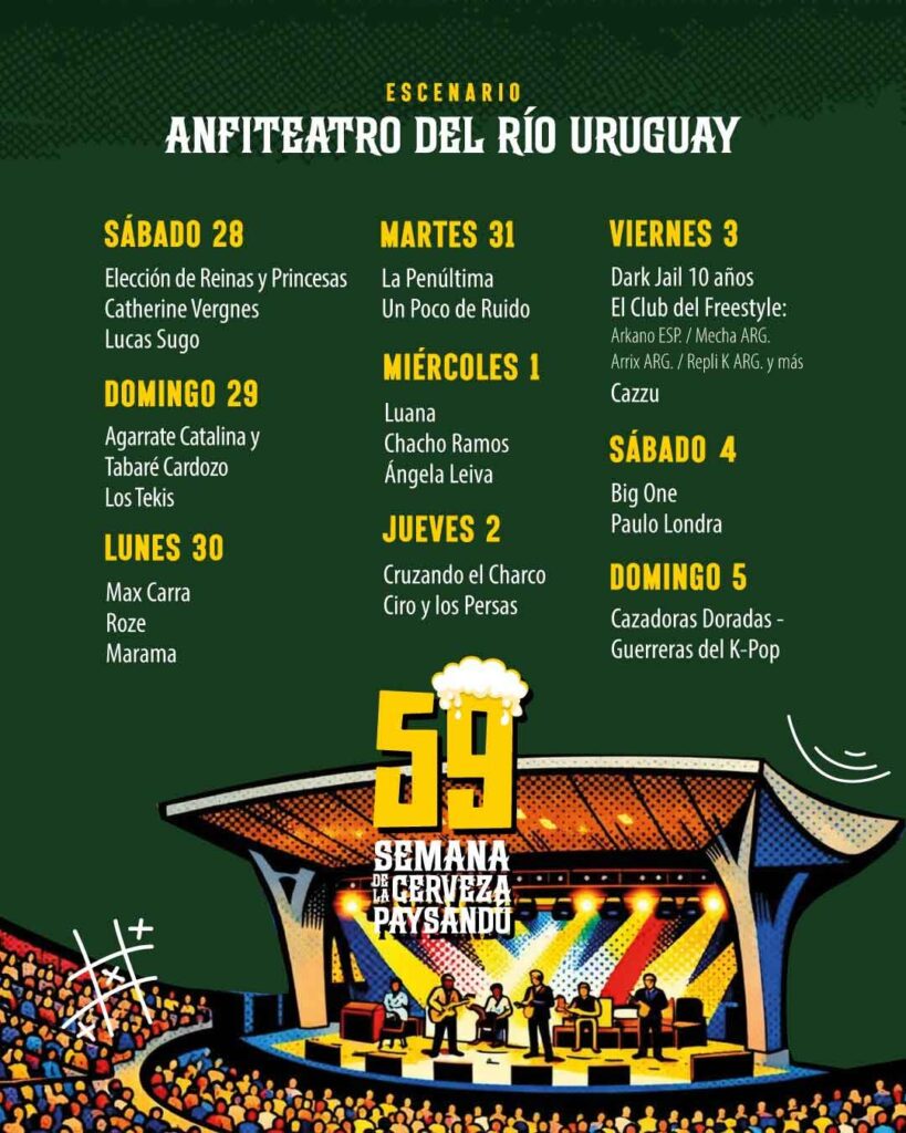 La programación se desarrollará a lo largo de ocho días e incluirá múltiples escenarios con presencia de artistas nacionales e internacionales. El epicentro musical será el Anfiteatro del Río Uruguay, que concentrará los shows principales, en línea con ediciones anteriores que combinaron propuestas de distintos géneros y convocaron a públicos diversos.